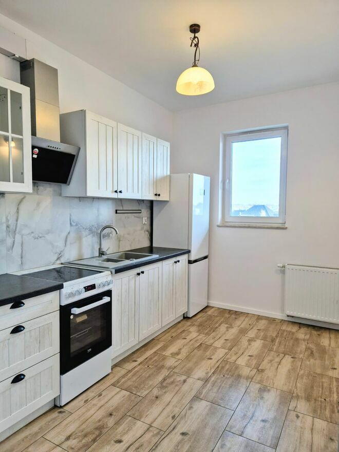 Kuchnia w pełni wyposażona: meble, kuchenka elektryczna, okap, lodówka – wszystko w cenie.